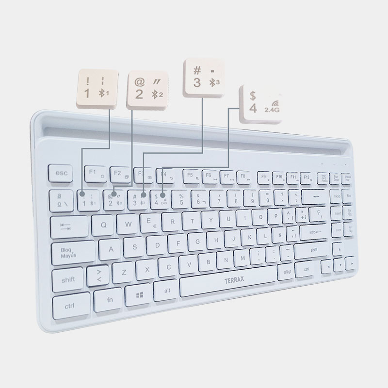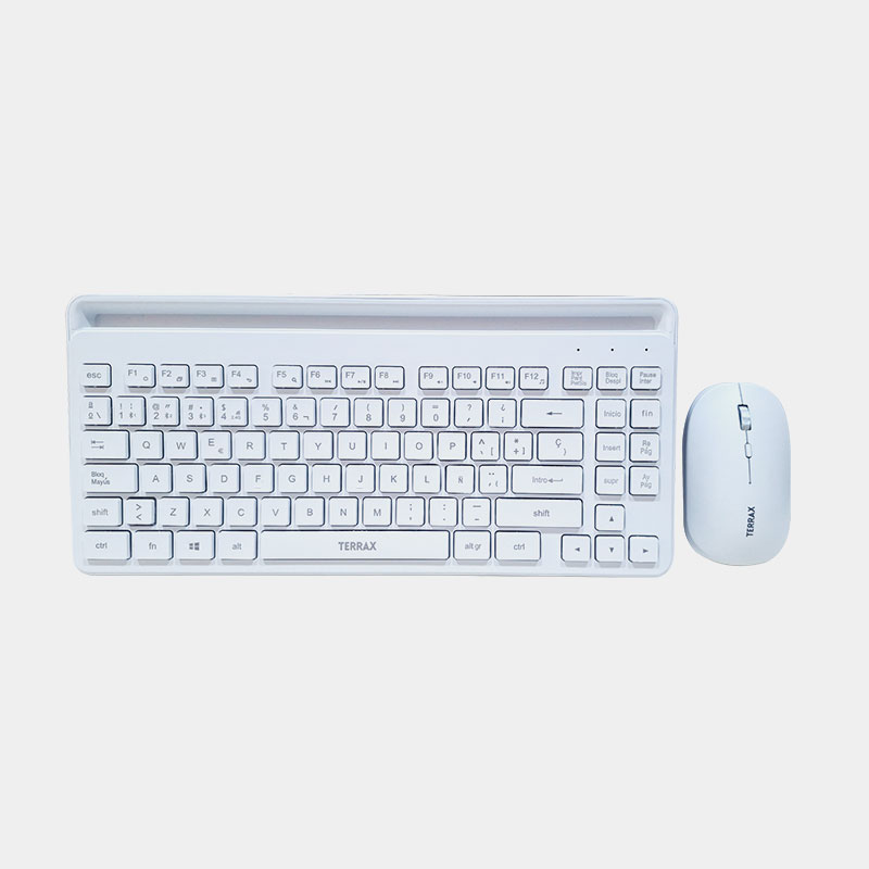 Kit Combo TERRAX de teclado y mouse recargable TX802M09 con conexión wireless y Bluetooth en color blanco, es el complemento ideal para tu setup de home office, oficina o para tu espacio de diseño o streaming. Sus teclas con acabado curvo y su mecanismo suave de acción lo vuelve la mejor opción para su uso diario. Incluye bandeja para celulares o tablet y bolígrafos.